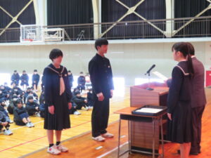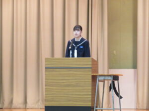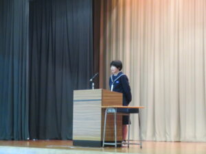 本校から参加した2グループは、『入善町の特産品」と『クマ対策を活用して入善町に興味をもってもらおう~里山の整備~』というテーマで発表しました。本当の議会が行われている議場での発表では大変緊張した様子でしたが、それぞれの提言を堂々と発表することができました。町長からも答弁をいただき、大変貴重な体験をすることができました。
