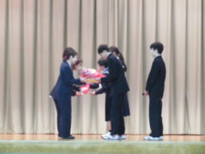また、各学年の代表者による作文発表では、駅伝やテスト勉強、学級での活動等、力を入れて取り組んだことや、学習・部活動等に一生懸命に取り組んで「継続は力なり」を実感したこと等を発表してくれました。