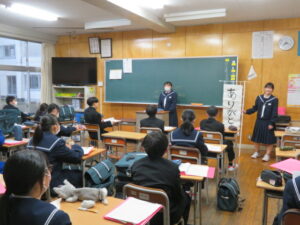 「社会に学ぶ『14歳の挑戦』」結団式が行われました 2025年6月27日 学校からのお知らせ いよいよ来週から、2年生で行われる 「社会に学ぶ『14歳の挑戦』」が始まります。 今日は、 「社会に学ぶ『14歳の挑戦』」に向けて結団式が行われ、生徒代表の言葉、校長先生からの言葉をいただきました。 3日間学校を離れての挑戦となりますが、働くことの意義や、自分の将来の生き方を考える機会になればと思います。 今年度は33の事業所にお世話になります。ご協力くださる事業所の方々のお力を借りて、たくさんの学びを得てほしいと思います。3日間、よろしくお願いいたします。