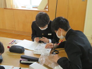 エネルギー変換の技術を学習しており、ペットボトルを置けばランタンにもなり、ラジオ機能もある「ボトルランタンダイナモ」を作成しています。細かいはんだづけに、ひと苦労していましたが、それ以上に出来上がった作品を見て喜んでいました。