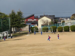 さわすぎ級の体育では、ちょうど晴れ間がのぞいた時間に、グラウンドでサッカーをしました。外に出られない日々が続いていたので、体をめいいっぱい動かして楽しんでいました。