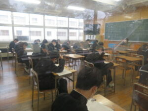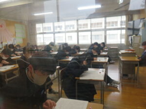 学年末考査が始まりました 2026年2月25日 学校からのお知らせ 本日から1・2年生は学年末考査、3年生は最後の実力テストが始まりました。 1・2年生にとってはこの1年間の学習の成果を確かめる大切な機会です。 開始直前まで教科書やノート、ワークを見返す姿が見られました。真剣に問題に向き合う生徒たちの姿から、この1年間の積み重ねの重みが伝わってきました。最後まで頑張れ!!