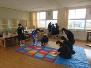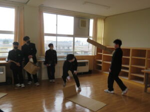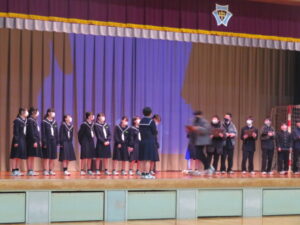 本日、学年末考査二日目が終了し、1年生は4時間目、3年生を送る会の練習を進めました。