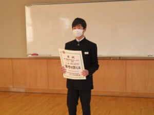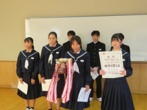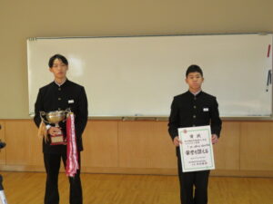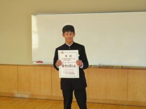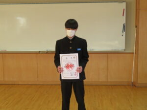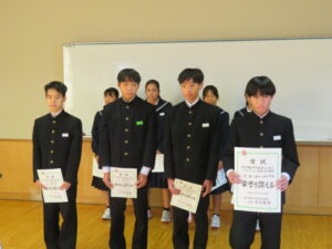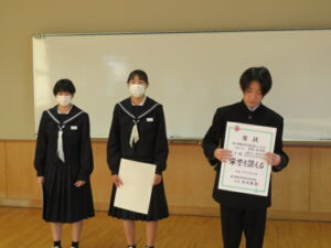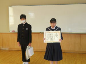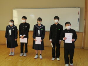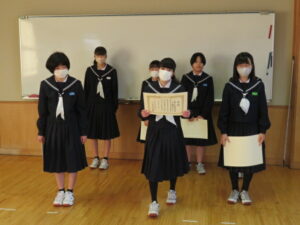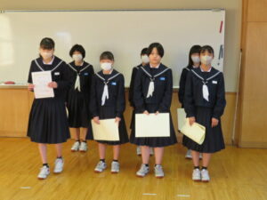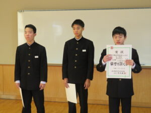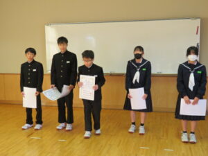 本日、朝、オンラインにて受賞披露が行われました。新川地区中学校新人大会や県駅伝競走大会、科学作品展、ポスターコンクール、作文・短歌、発明工夫展等の受賞を披露しました。