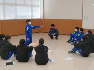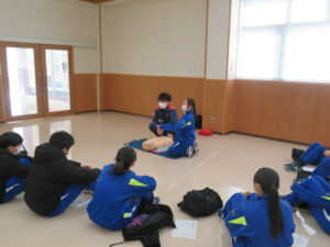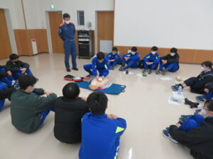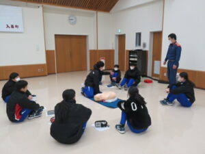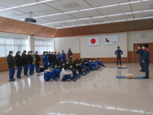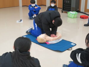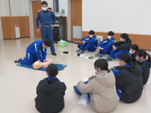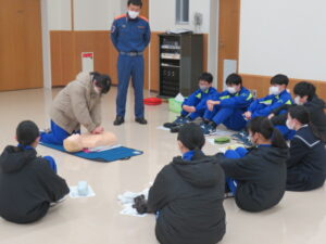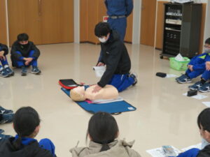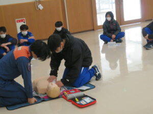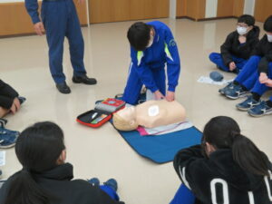 始めて行う生徒も多くいましたが、署員の分かりやすい見本や説明で、胸骨圧迫やAEDの使用方法を全員が一通り体験することができました。