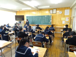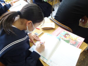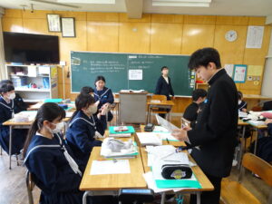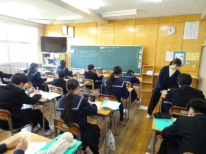 4月28日(火)、1年1組では英語科で「be動詞」の学習をしています。「I am Michael Jackson.」「I am not Michael Jackson.」といった表現を学びました。2組では、家庭科で「食事が果たす役割を理解しよう」という学習課題に取り組み、グループで話し合いました。3組では、国語科で谷川俊太郎さんの詩「朝のリレー」の表現の効果を考えました。どの学級も、中学校の学習に楽しく取り組んでいます。